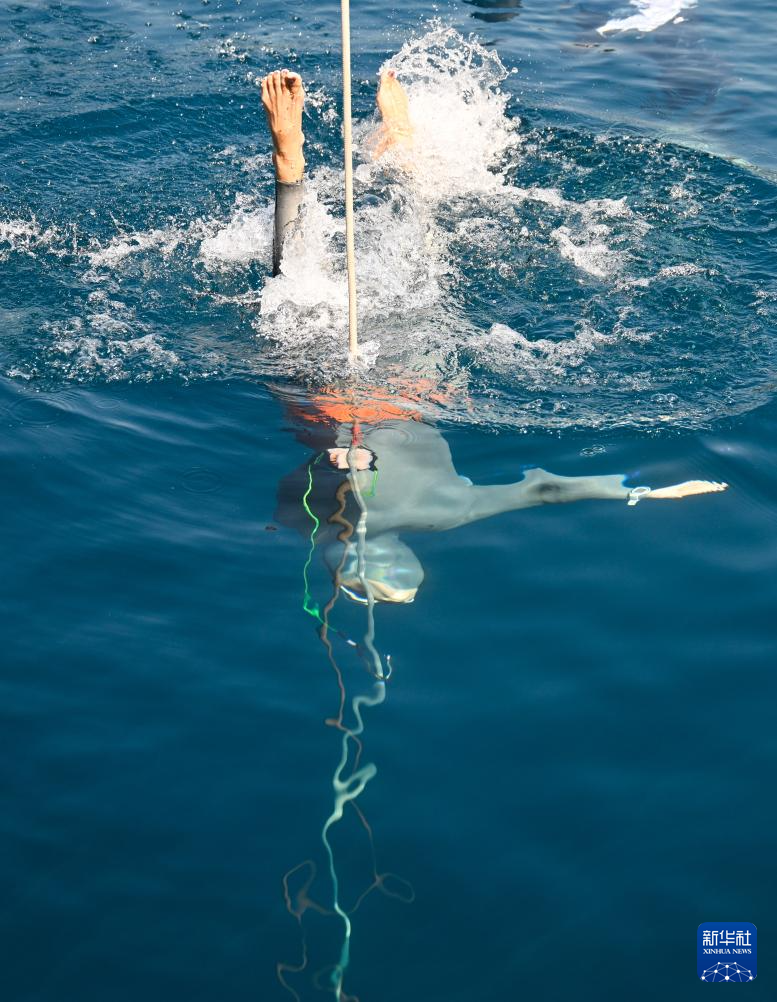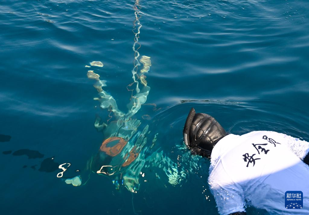 8月21日,在江苏盱眙象山国家矿山(地质)公园水域举行的恒重无蹼项目比赛中,参赛选手潜入水中。