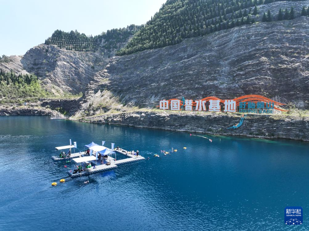 这是在江苏盱眙象山国家矿山(地质)公园水域举行的恒重无蹼项目比赛现场(8月21日摄,无人机照片)。