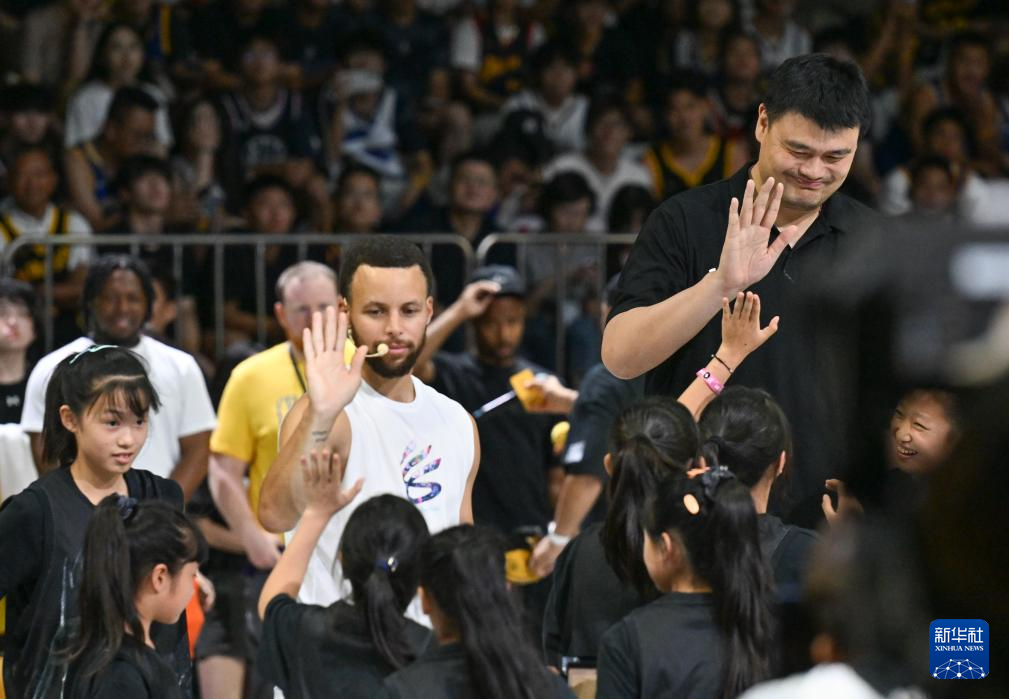 8月20日,姚明(右上)、库里与来自四川的乡村女子篮球队队员互动。