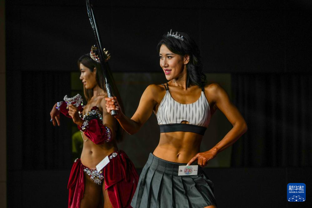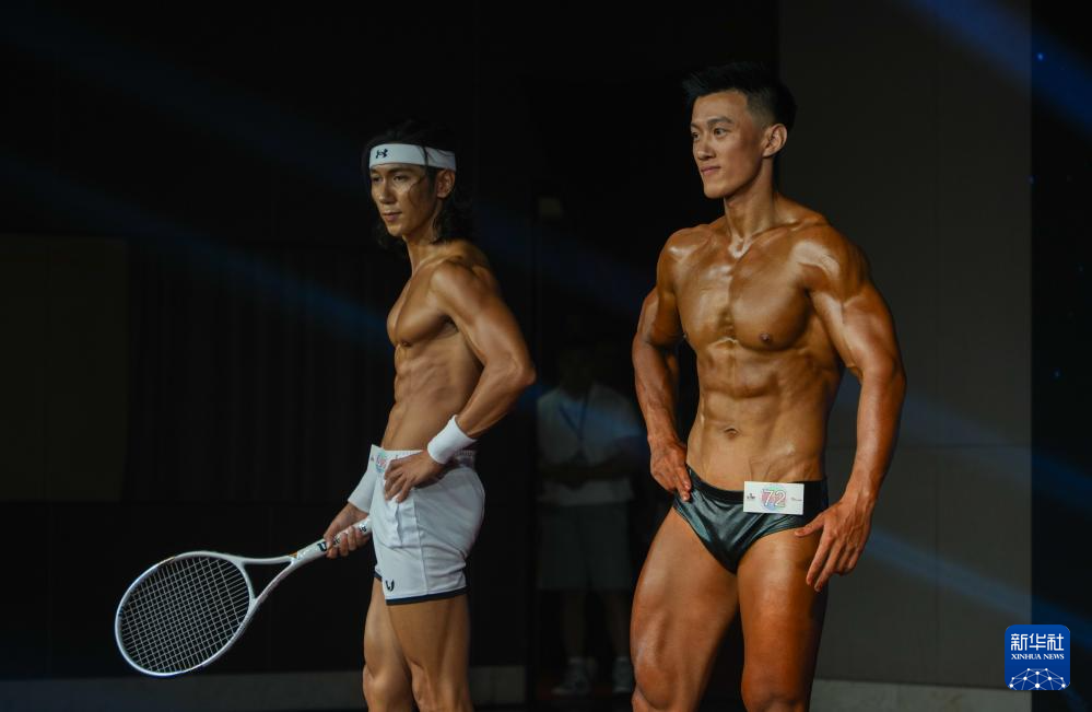 8月23日,选手丁杉(右)在健身健美比赛中。