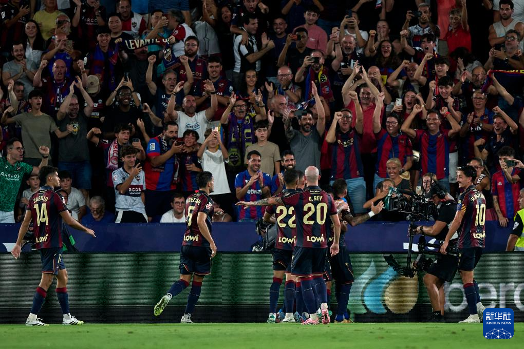 8月23日,莱万特队球员在比赛中庆祝进球。