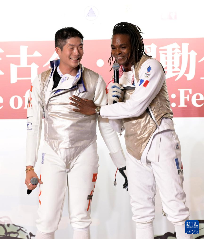 8月26日,奥运会冠军、中国香港选手张家朗(左)与奥运会冠军、法国选手勒福尔在花剑表演赛后。
