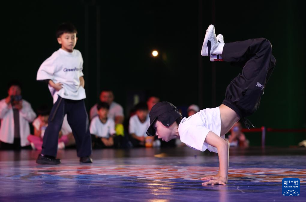 8月27日,蔡哲杭(右)在比赛中。最终,他获得霹雳舞U10组第四名。新华社发(梁子栋 摄)