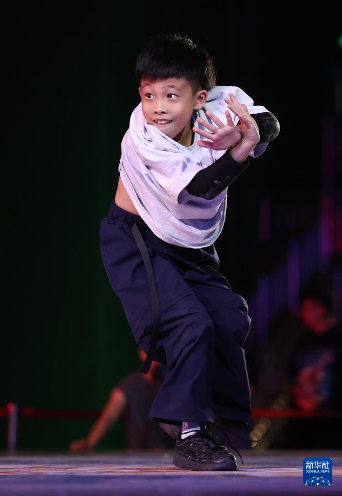 8月27日,吴泽轩在比赛中。最终,他获得霹雳舞U10组亚军。新华社发(梁子栋 摄)