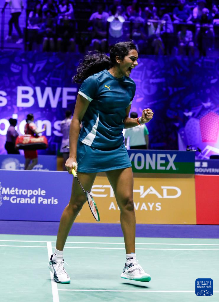 8月28日,印度选手辛杜在比赛中庆祝得分。新华社记者 张帆 摄