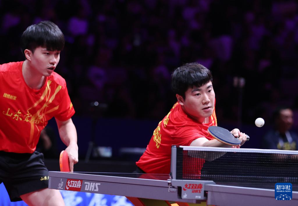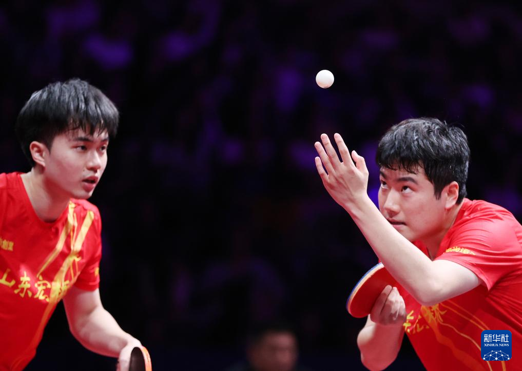 8月29日,山东魏桥·向尚运动队组合林昀儒/梁靖崑(右)在比赛中。他们在双打比赛中3比0战胜中超电缆·福建安井队组合宋卓衡/梁俨苧。