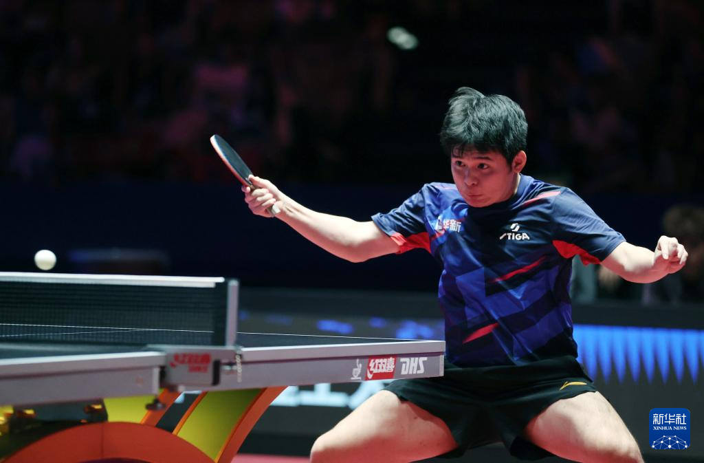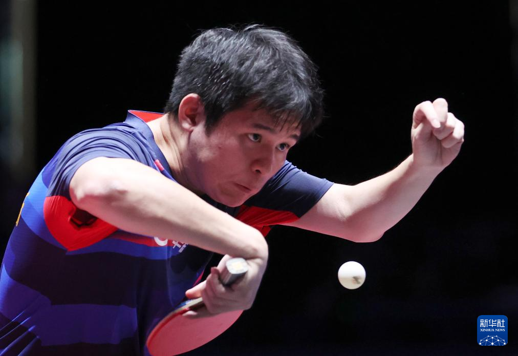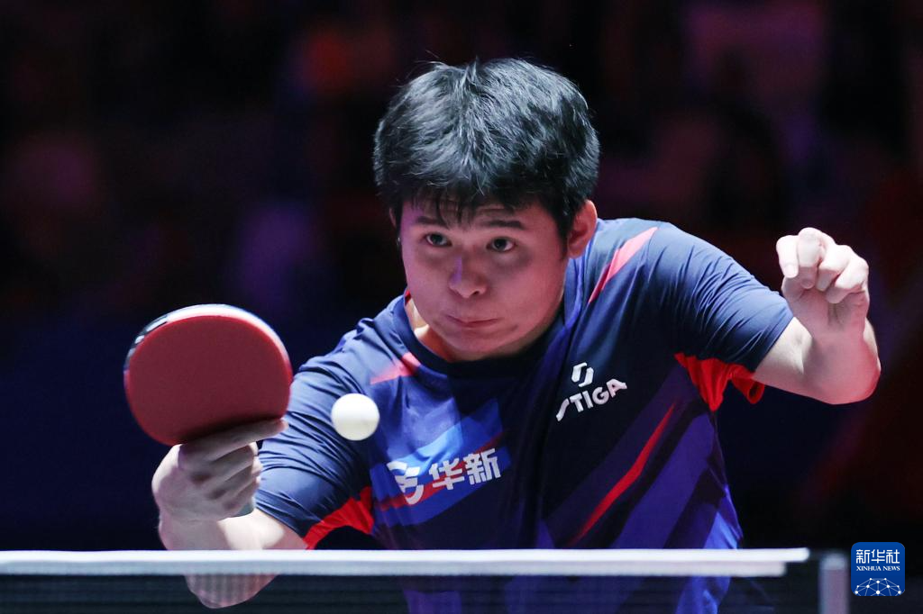 8月30日,黄石华新队选手林诗栋在比赛中回球。他在单打比赛中3比0战胜汕头明润队选手陈垣宇。