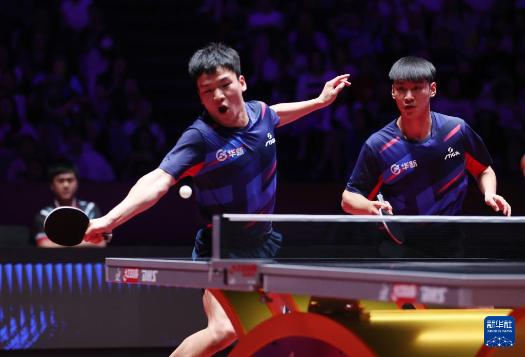 8月30日,黄石华新队组合向鹏/薛飞(前)在比赛中。他们在双打比赛中3比1战胜汕头明润队组合林高远/徐海东。