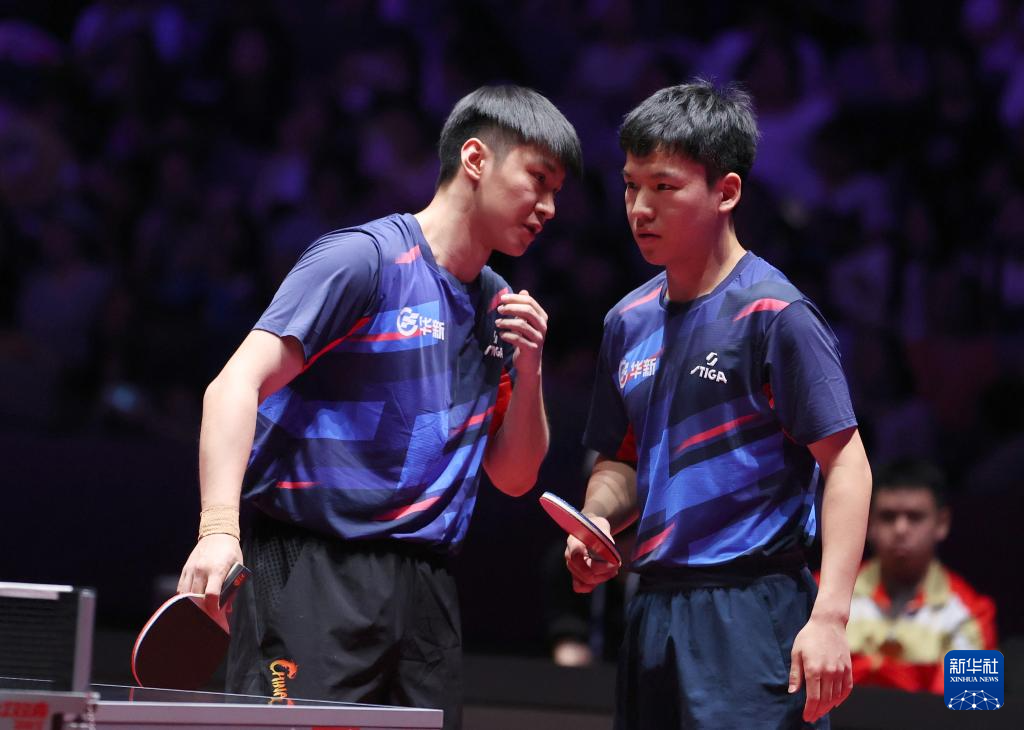 8月30日,黄石华新队组合向鹏(右)/薛飞在双打比赛中商议战术。他们在双打比赛中3比1战胜汕头明润队组合林高远/徐海东。