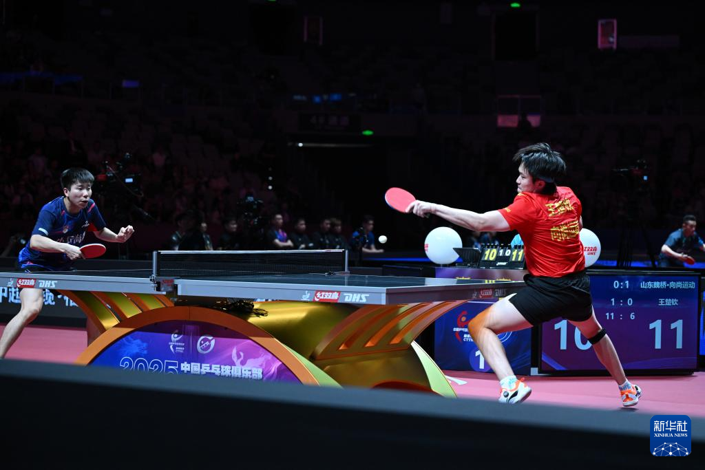 当日,在新疆乌鲁木齐市举行的2025赛季中国乒乓球俱乐部超级联赛常规赛第三阶段男子团体比赛中,山东魏桥·向尚运动队3比1战胜山东鲁能队。