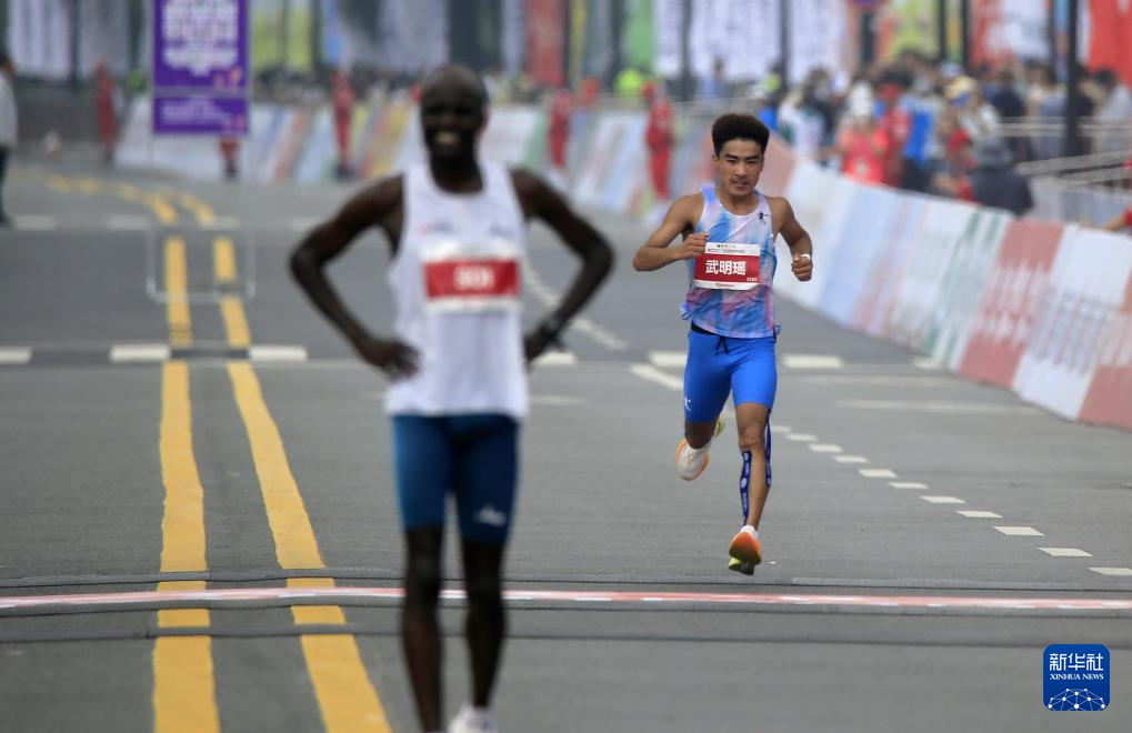 8月31日,参加马拉松男子组比赛的中国选手武明瑶(右)到达终点。