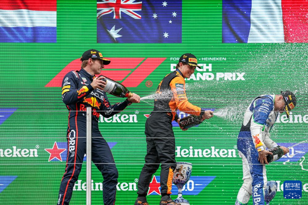 8月31日,迈凯伦车队澳大利亚车手皮亚斯特里(中)在领奖台上与红牛车队荷兰车手维斯塔潘(左)、红牛二队法国车手哈贾尔一同庆祝。