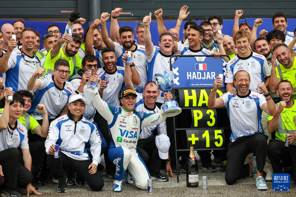 8月31日,红牛二队法国车手哈贾尔(前排右四)在比赛后与车队成员庆祝。