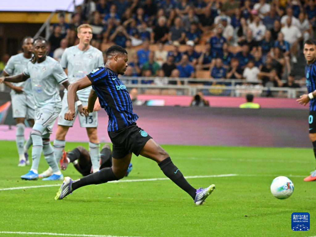 8月31日,国际米兰队球员邓弗里斯在比赛中射门得分。