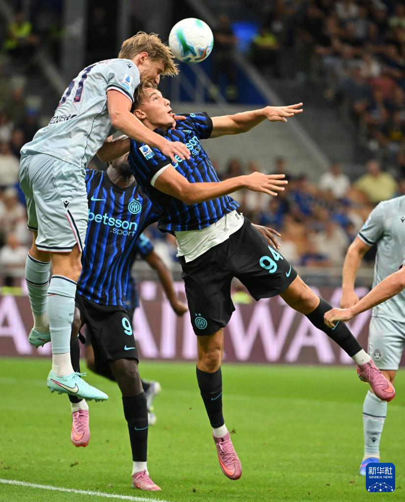 8月31日,国际米兰队球员埃斯波西托(右)与乌迪内斯队球员克里斯滕森在比赛中争顶。