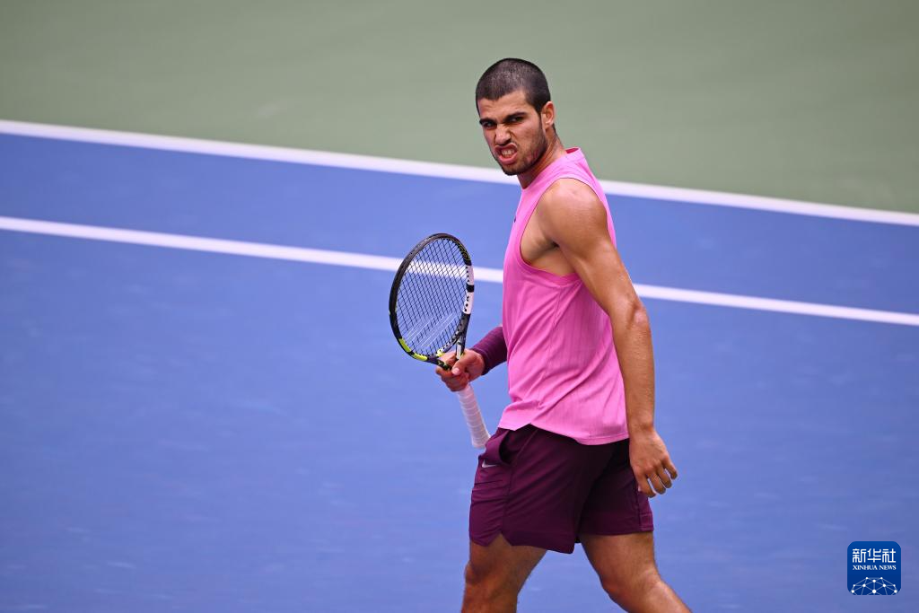 9月5日,阿尔卡拉斯在比赛中庆祝得分。