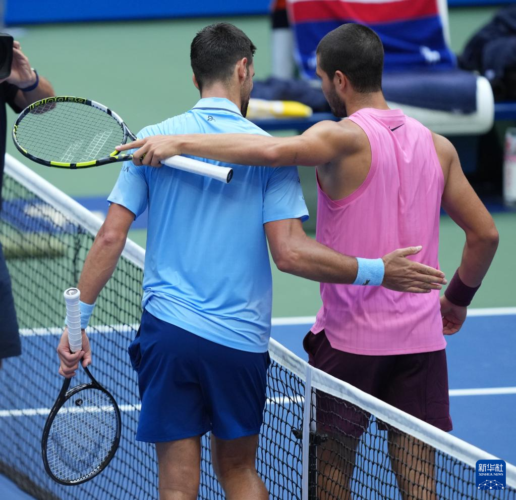 9月5日,阿尔卡拉斯(右)在比赛后与焦科维奇相互致意。