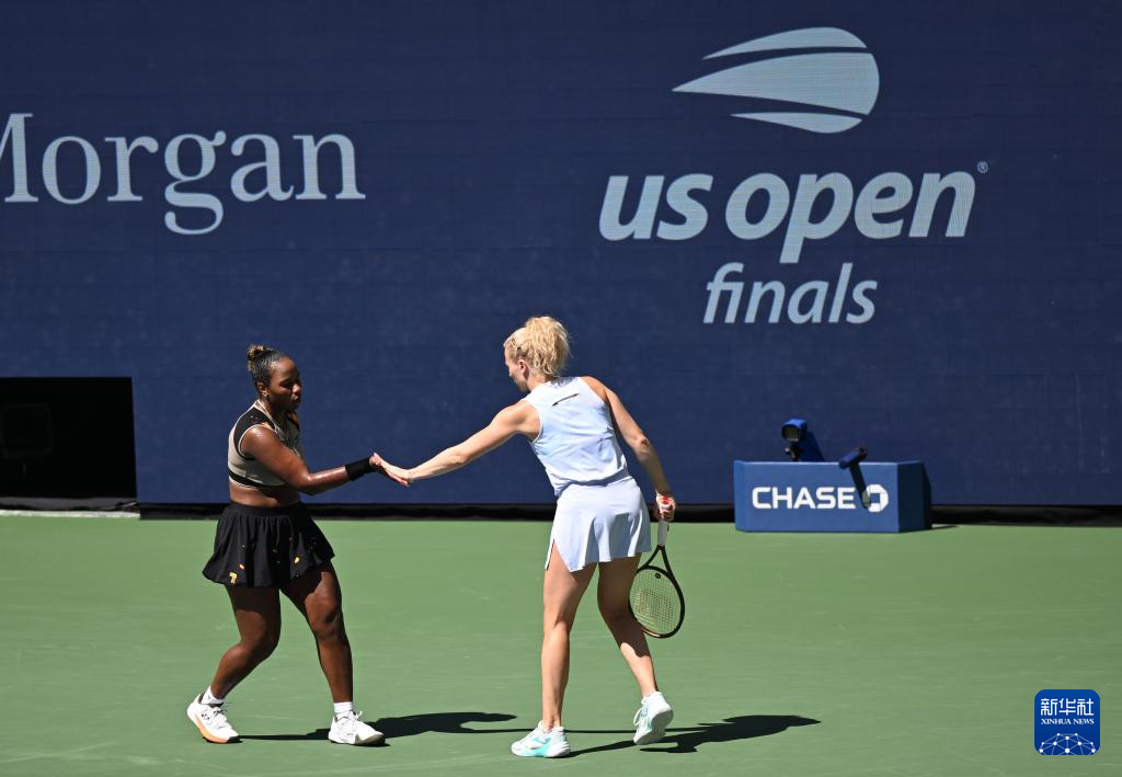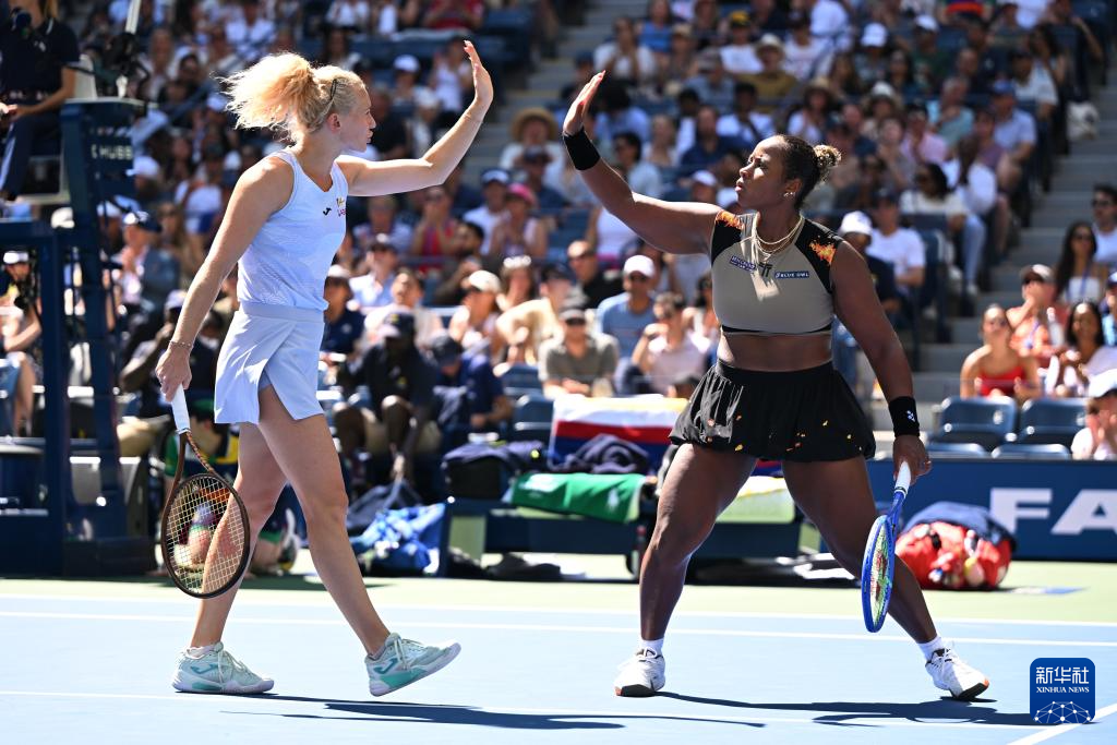9月5日,西尼亚科娃(左)/汤森德在比赛中庆祝得分。