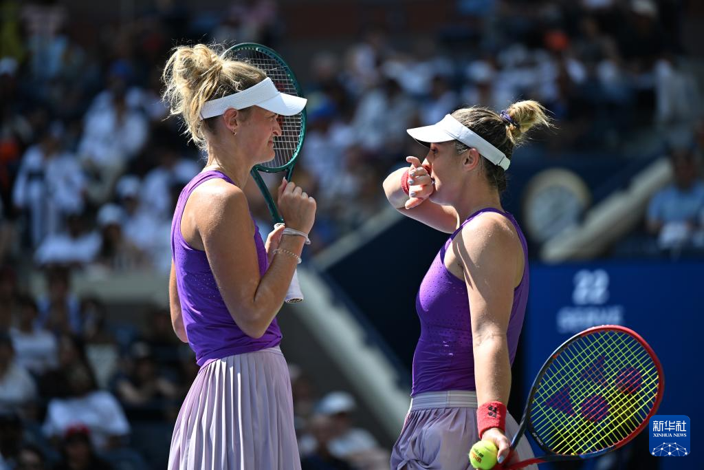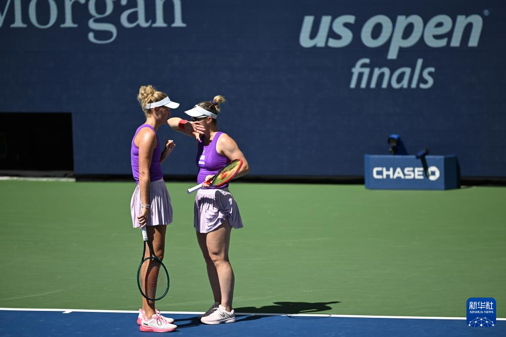 9月5日,西尼亚科娃(右)/汤森德在比赛中商讨战术。