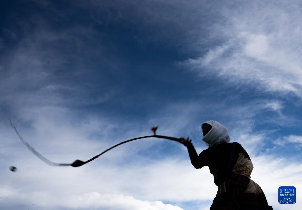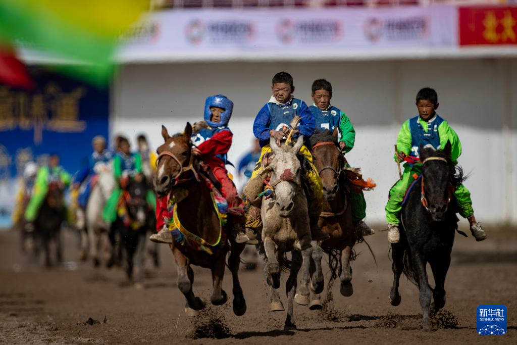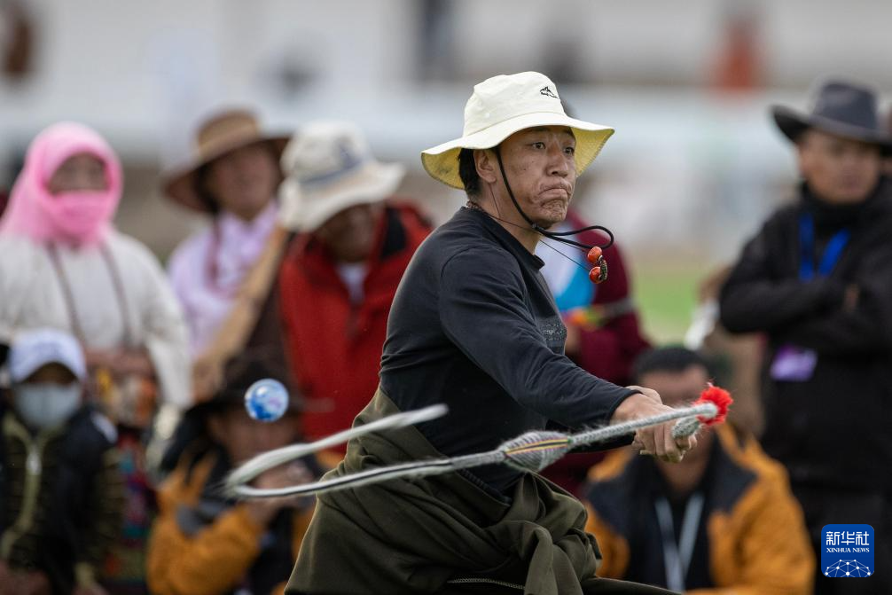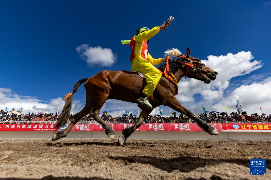 9月6日,在那曲市恰青赛马节现场,一名选手们参加乌尔朵比赛。
