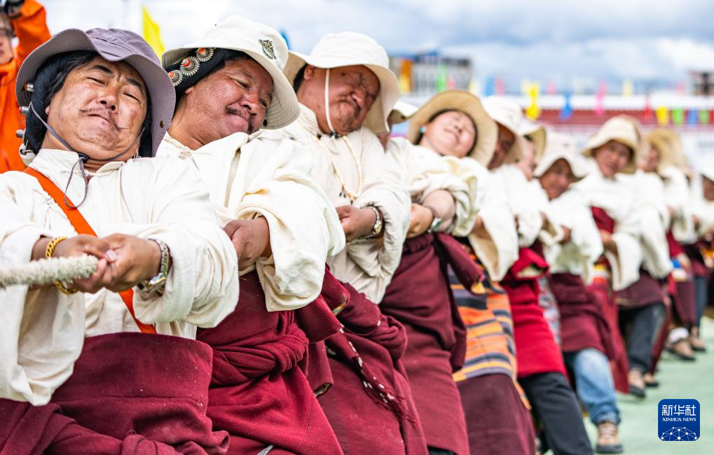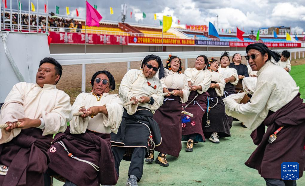 9月6日,在那曲市恰青赛马节现场,选手们参加拔河比赛。