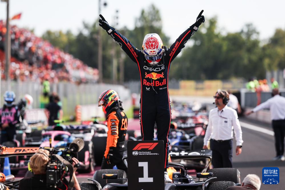 9月7日,红牛车队荷兰车手维斯塔潘(上)在夺冠后庆祝。