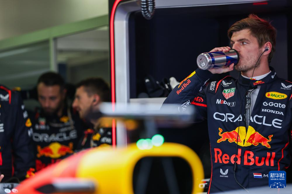 9月7日,红牛车队荷兰车手维斯塔潘(右)赛前在车库做准备。