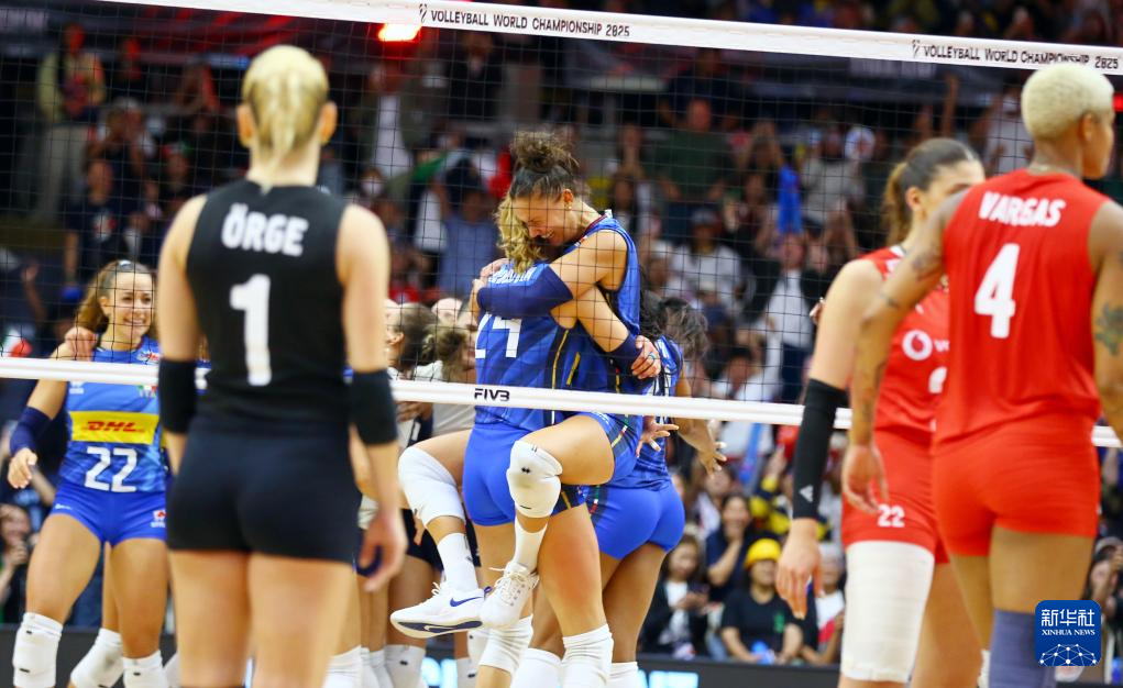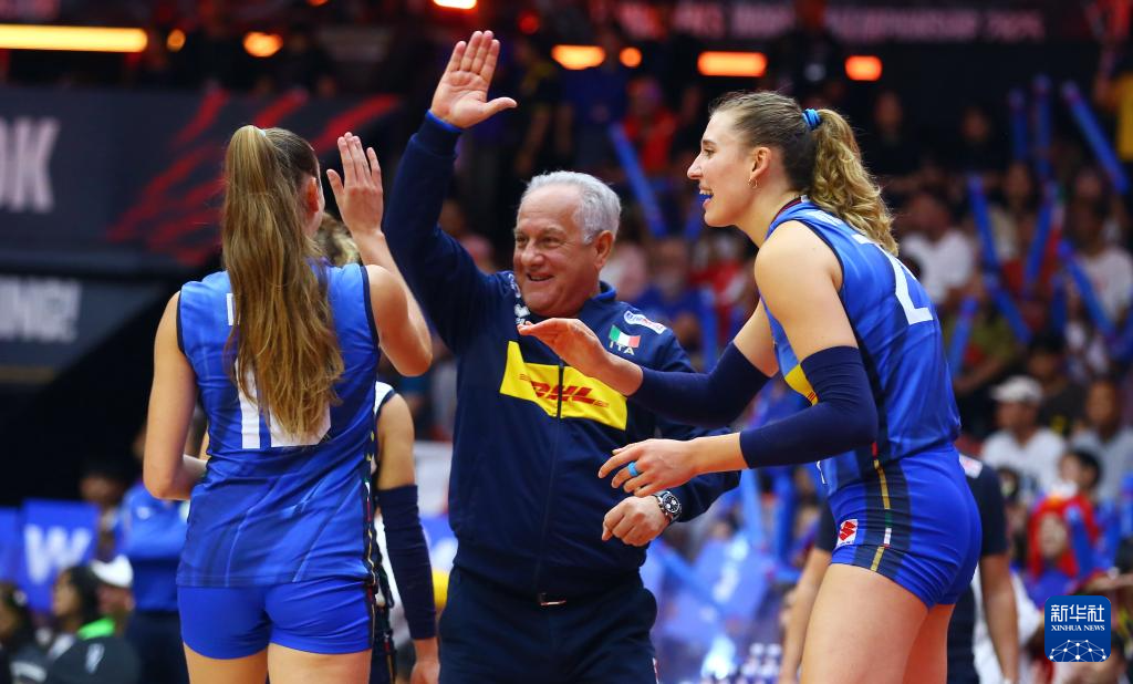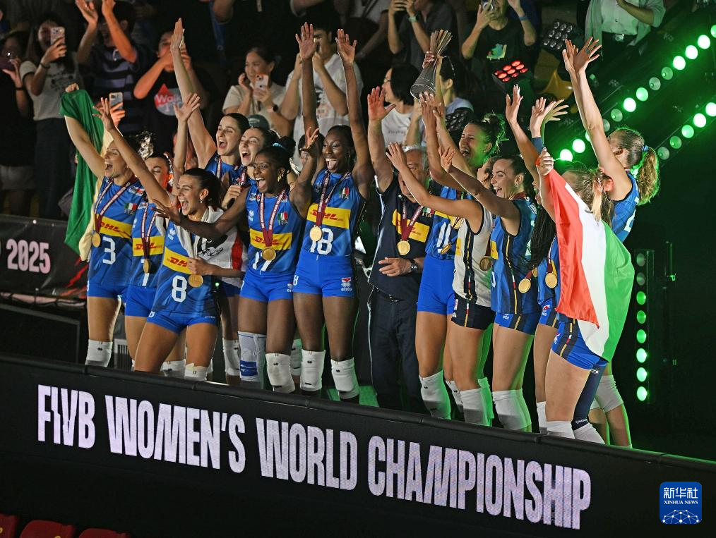 当日,在泰国曼谷进行的2025年世界女排锦标赛决赛中,意大利队3比2战胜土耳其队,获得冠军。