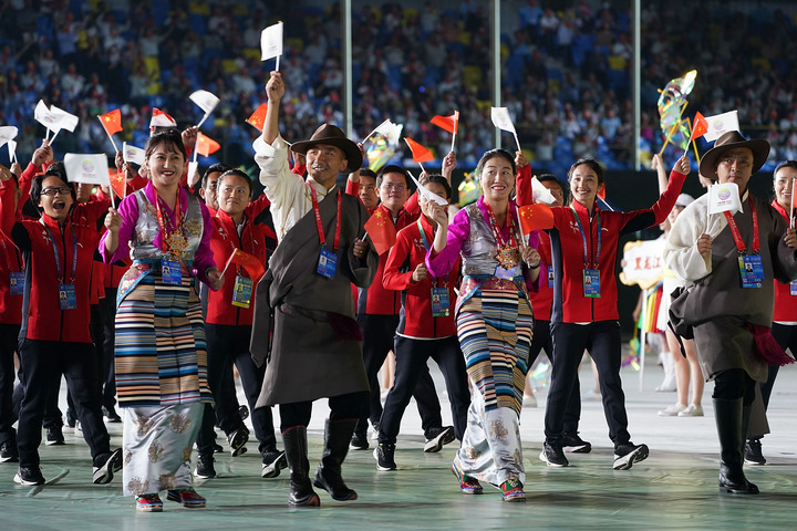 第十四届全运会开幕式,西藏自治区体育代表团在入场仪式上(2021年9月15日摄)。新华社记者 彭子洋 摄