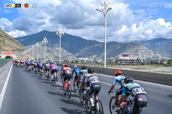 2025中国西藏第六届跨喜马拉雅国际公路自行车极限赛,选手在第三阶段拉萨站比赛中。(主办方供图)