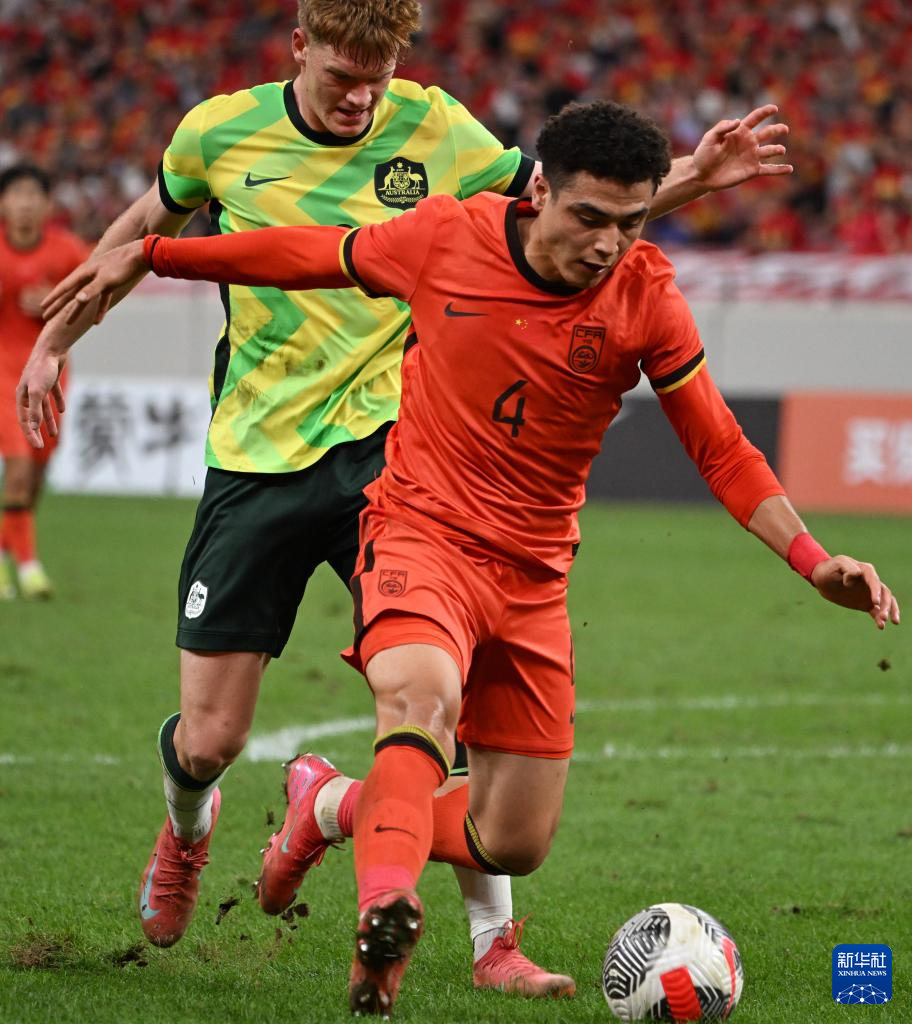 9月9日,中国队球员王钰栋(右)与澳大利亚队球员基利·亚当森在比赛中拼抢。