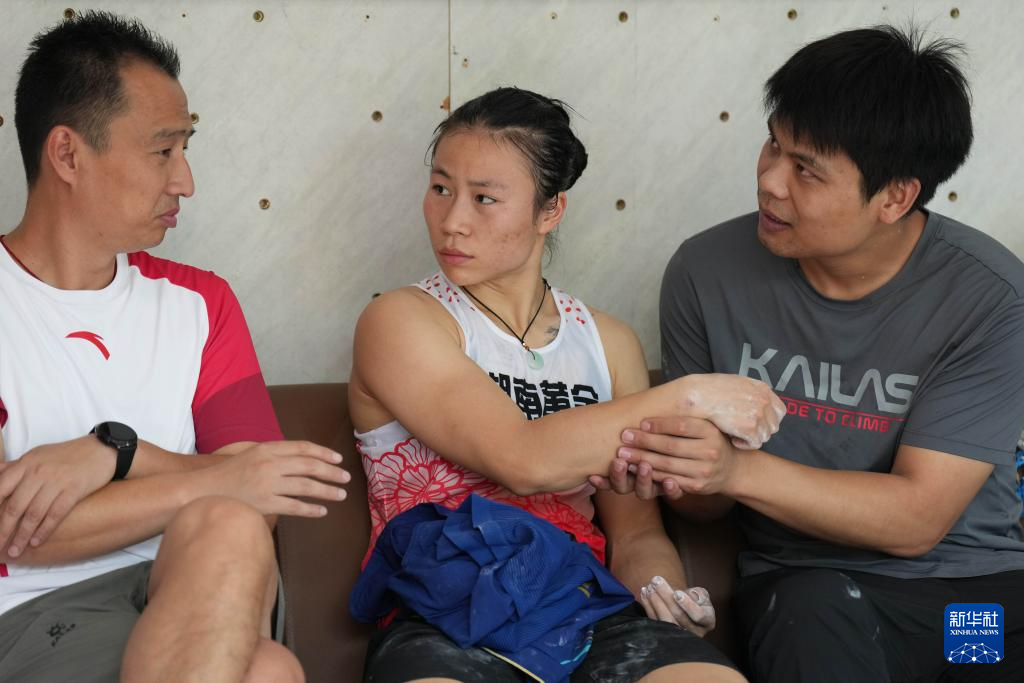 9月10日,湖南黄金攀岩队选手、2024巴黎奥运会攀岩女子速度亚军、成都世运会攀岩女子速度、女子接力冠军邓丽娟(中)在比赛间隙放松。