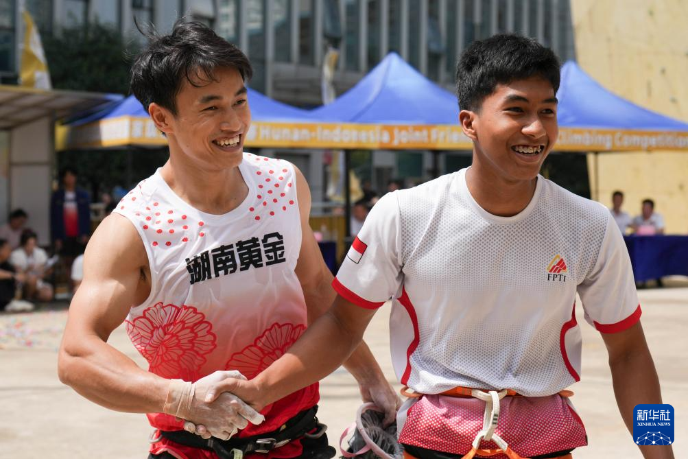 9月10日,中国湖南黄金攀岩队选手、第十四届全运会攀岩男子速度冠军龙金宝(左)与印度尼西亚选手安塔斯亚菲·罗比·阿尔·希尔米在比赛后握手。