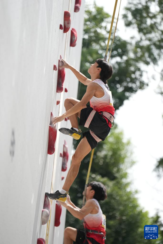 9月10日,湖南黄金攀岩队选手、2024巴黎奥运会攀岩男子速度赛亚军伍鹏(前)在比赛中。