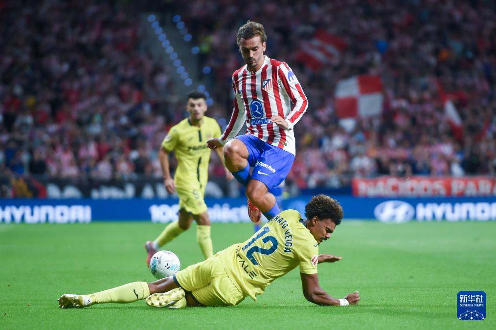 9月13日,马德里竞技队球员格列兹曼(上)与比利亚雷亚尔队球员韦加在比赛中拼抢。