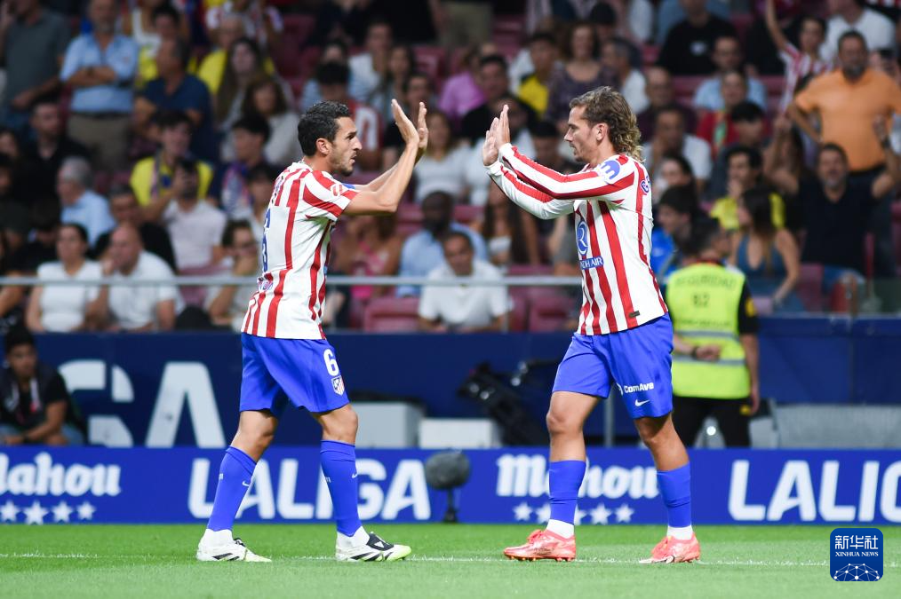 9月13日,马德里竞技队球员科克(左)和格列兹曼在比赛中庆祝球队进球。