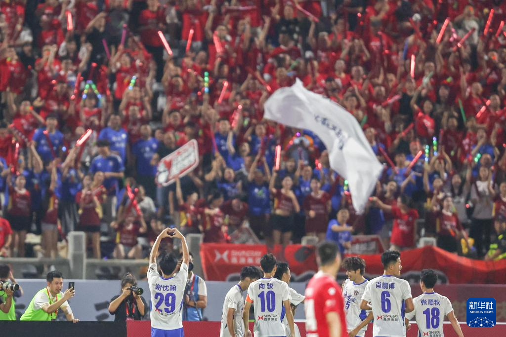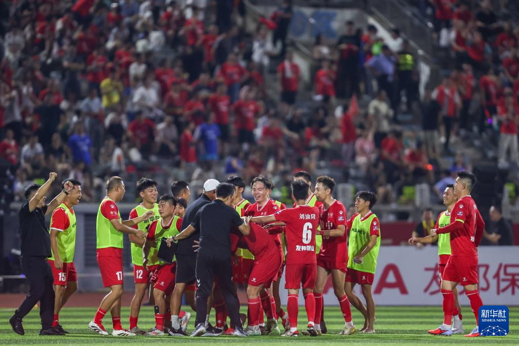 9月13日,九龙鑫源熊猫队球员在进球后与观众互动。