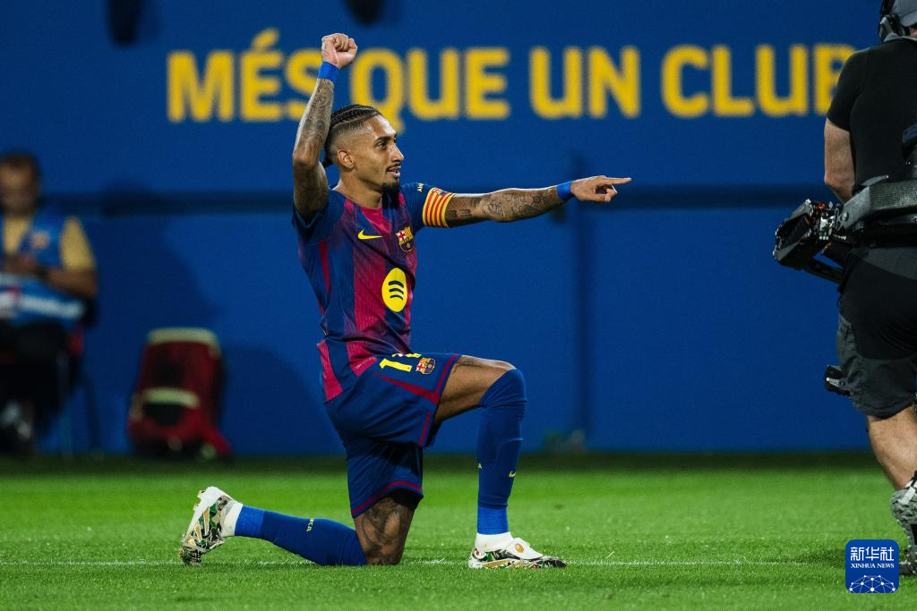 9月14日,巴塞罗那队球员拉菲尼亚在比赛中庆祝进球。