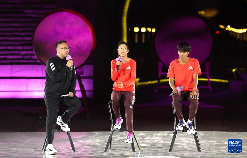 9月14日,在北京永定门前,中国马拉松运动员李丹(中)、陈雨繁(右)在训练营启动仪式上。
