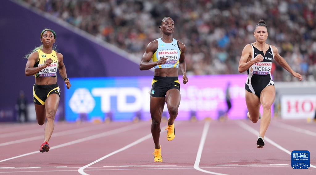 9月14日,圣卢西亚选手阿尔弗雷德(右)在比赛中冲线。最终,她晋级决赛。