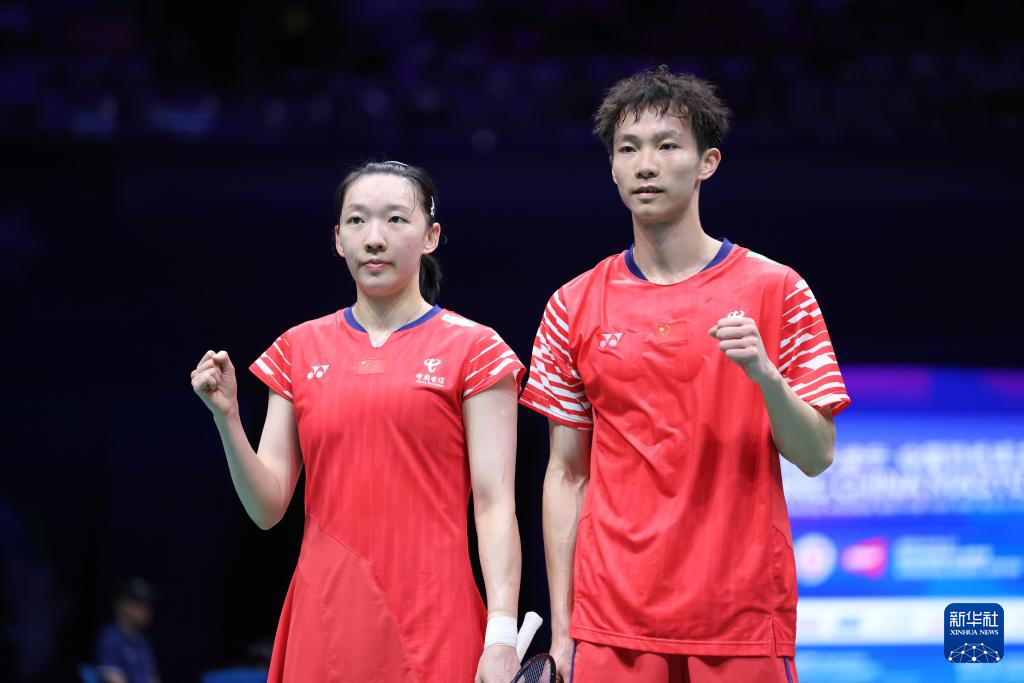 9月16日,中国组合蒋振邦/魏雅欣(左)在混双比赛后合影。