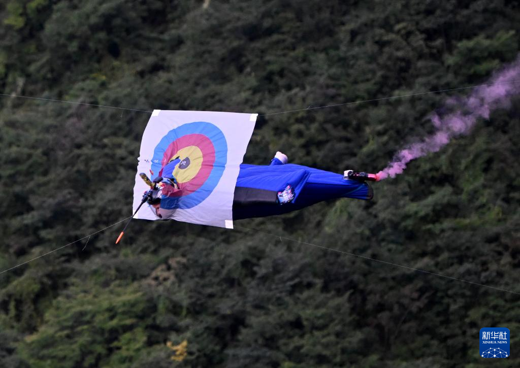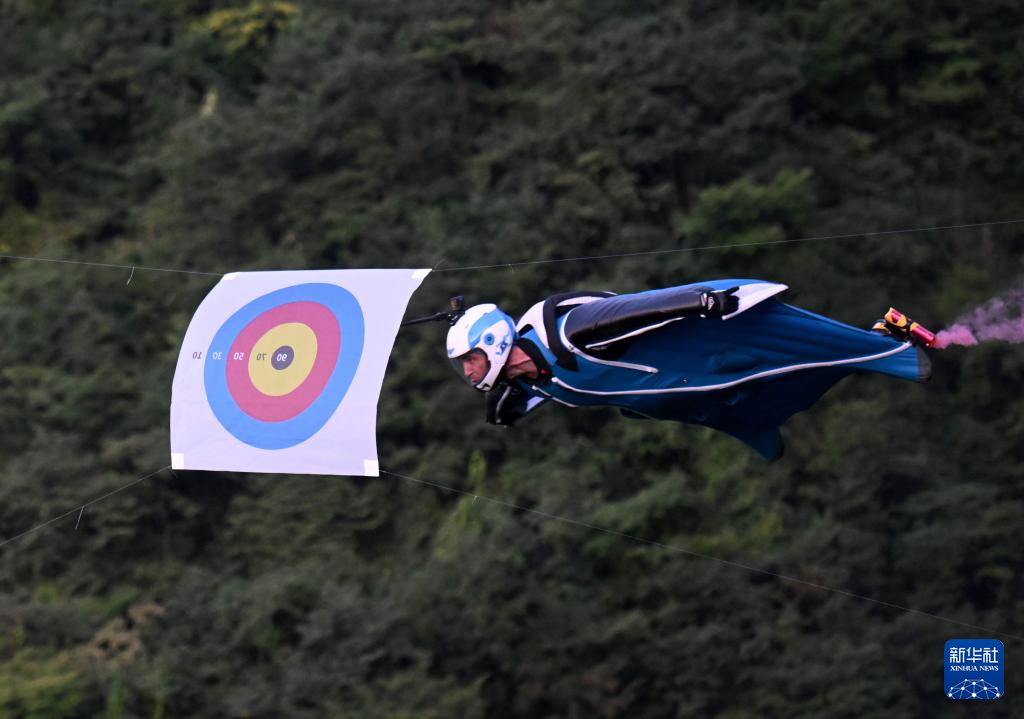 9月16日,翼装飞行运动员在进行精准穿靶训练。