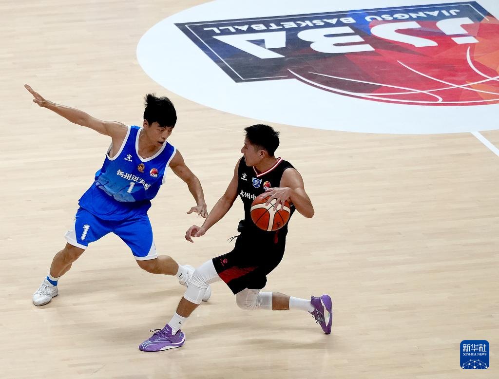 9月16日,苏州中诚队球员王跃发(右)带球突破扬州迈安德队球员张宇翔的防守。