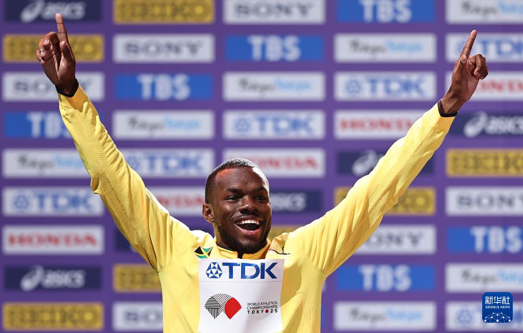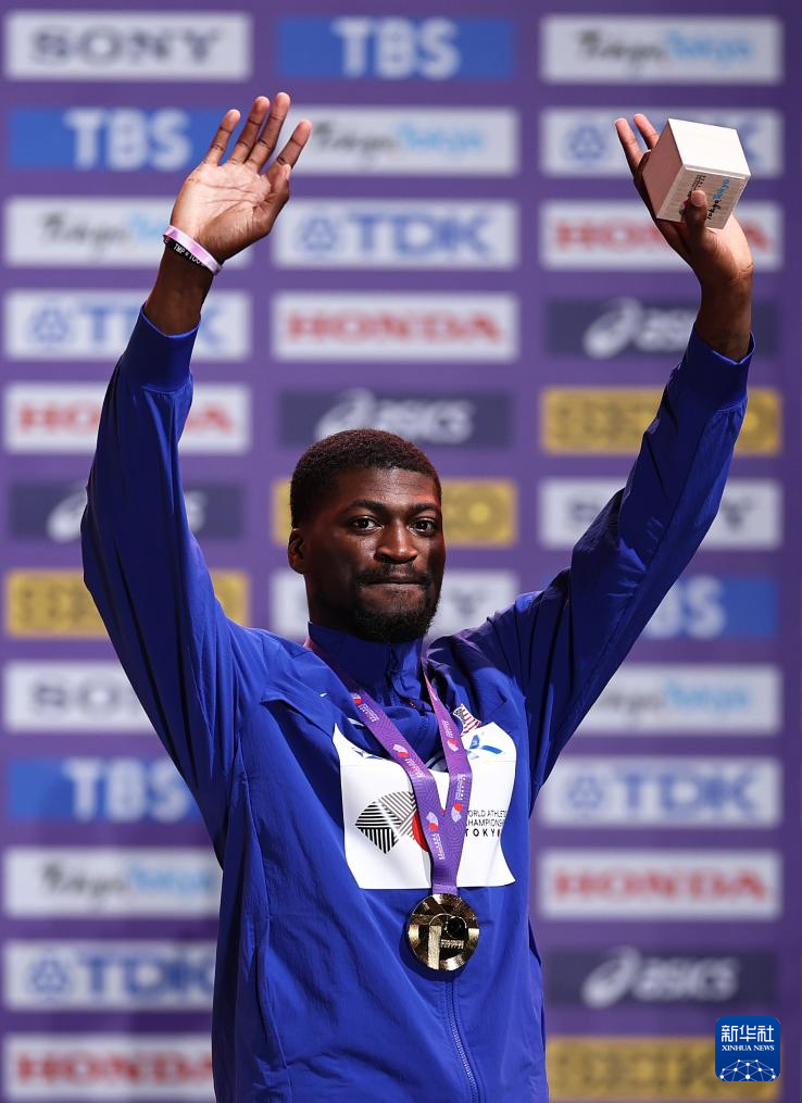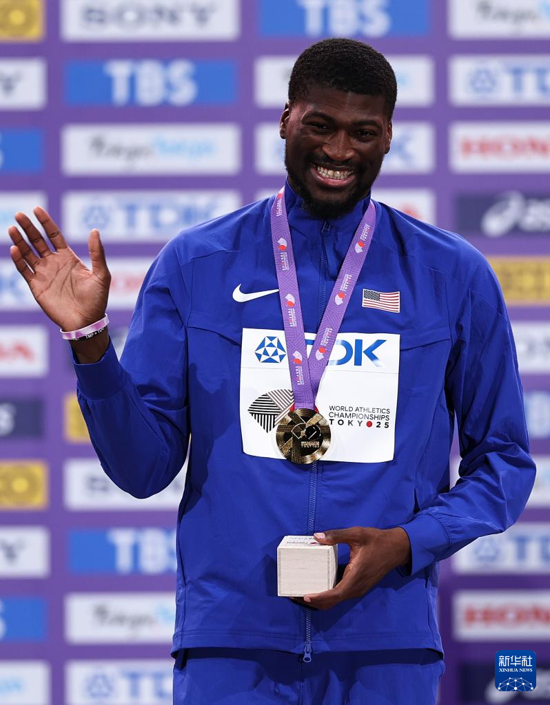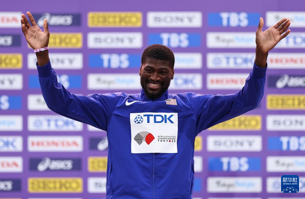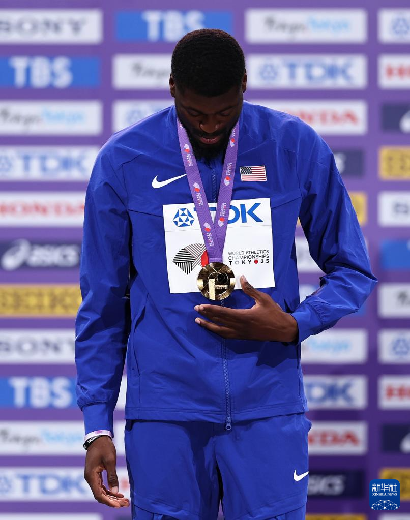 当日,2025年世界田径锦标赛男子110米栏颁奖仪式在日本东京举行。