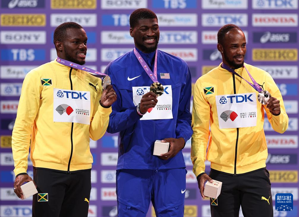9月17日,冠军美国选手科德尔(中)、亚军牙买加选手奥兰多·贝内特(左)和季军牙买加选手泰勒·梅森在颁奖仪式上。