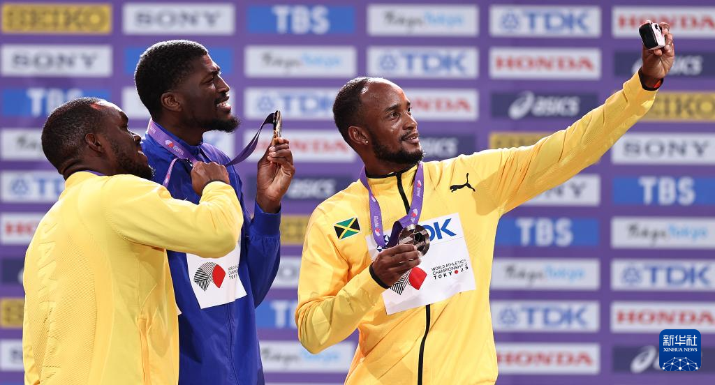 9月17日,冠军美国选手科德尔(中)、亚军牙买加选手奥兰多·贝内特(左)和季军牙买加选手泰勒·梅森在颁奖仪式上自拍合影。