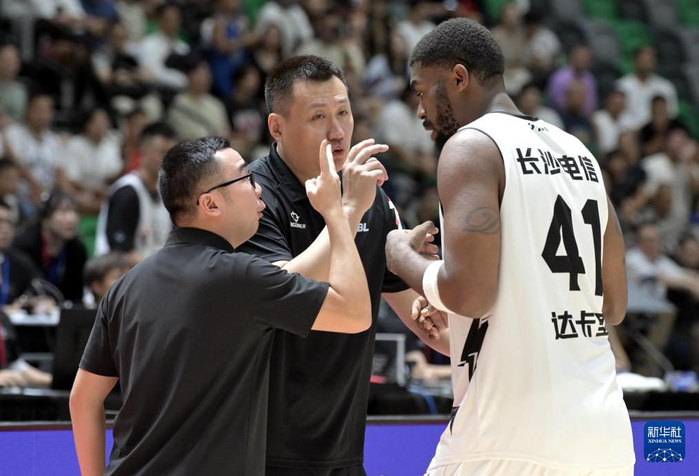 9月17日,湖南长沙电信勇胜队主教练张伟(中)在比赛间隙指导球员约翰逊(右)。