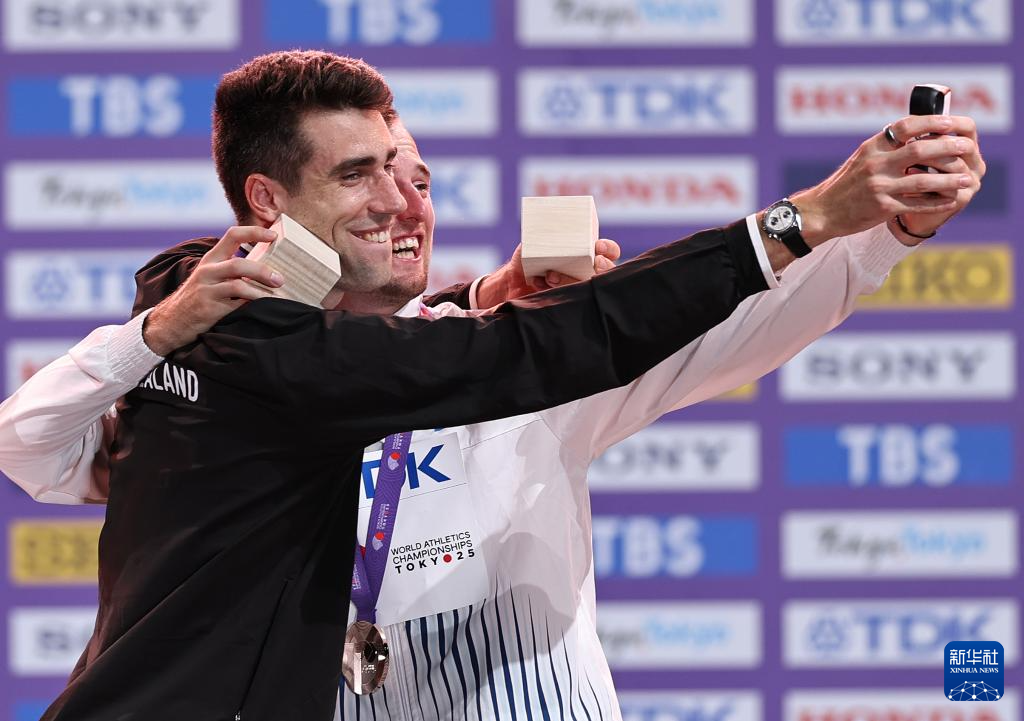 9月17日,冠军新西兰选手科尔(左)和季军捷克选手斯特菲拉在颁奖仪式上自拍合影。