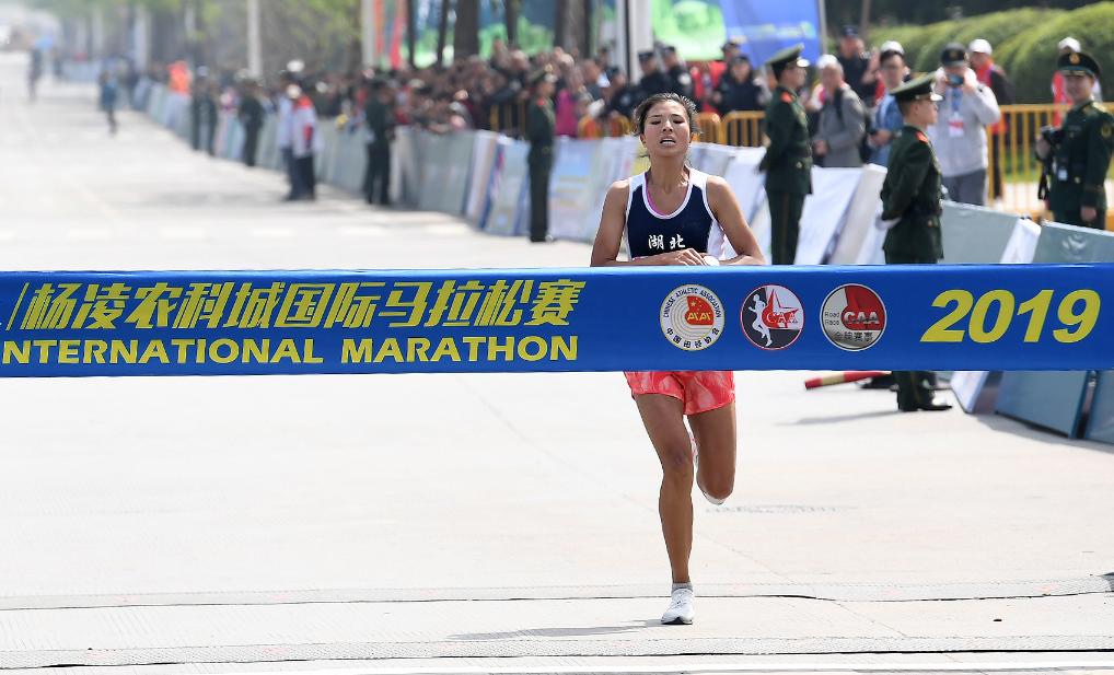 2019年4月14日,姚妙在杨凌农科城国际马拉松赛上获得女子组全程马拉松冠军。新华社记者 刘潇 摄