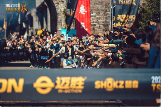 2024年柴古唐斯括苍越野赛上,姚妙在冲线前与观众们击掌。图源:柴古唐斯括苍越野赛赛事组委会